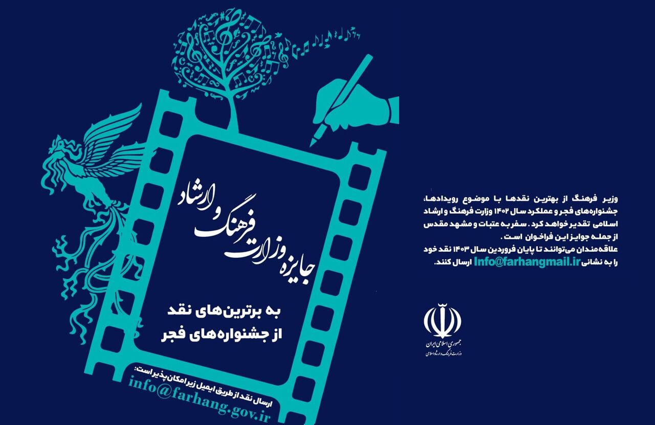 وزیر فرهنگ از بهترین نقدها با موضوع رویدادها، جشنواره‌های فجر و عملکرد سال ۱۴۰۲ وزارت فرهنگ و ارشاد اسلامی تقدیر خواهد کرد. سفر به عتبات و مشهد مقدس از جمله جوایز این فراخوان است.
