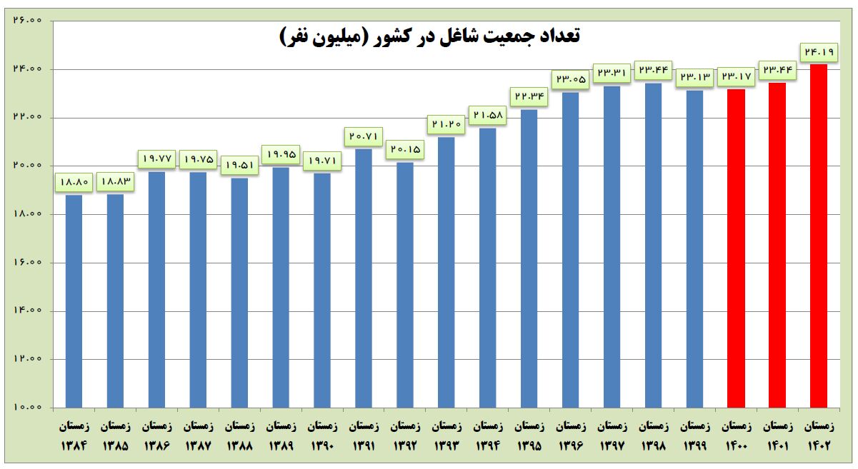 نکته مهم آمار جمعیت شاغل در زمستان ۱۴۰۲ این است که نسبت به فصول مشابه در سال‌های گذشته، زمستان ۱۴۰۲ بیشترین تعداد شاغلین در تاریخ کشور ثبت شده است. این برای اولین بار است که در فصل زمستان تعداد جمعیت شاغل در کشور از ۲۴ میلیون نفر فراتر رفته است.
